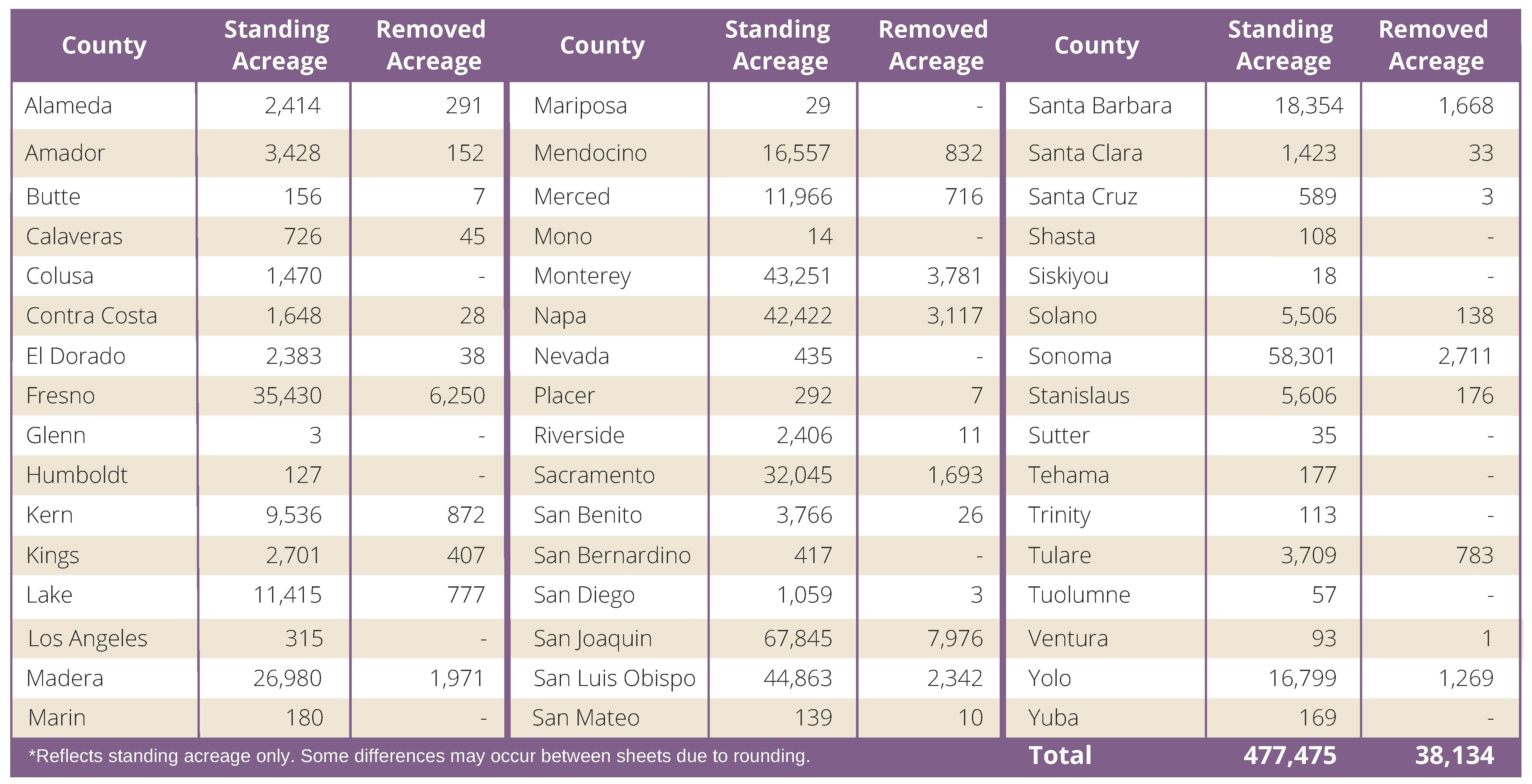 The table below shows standing winegrape acreage and removals by California county as of August 1, 2025.