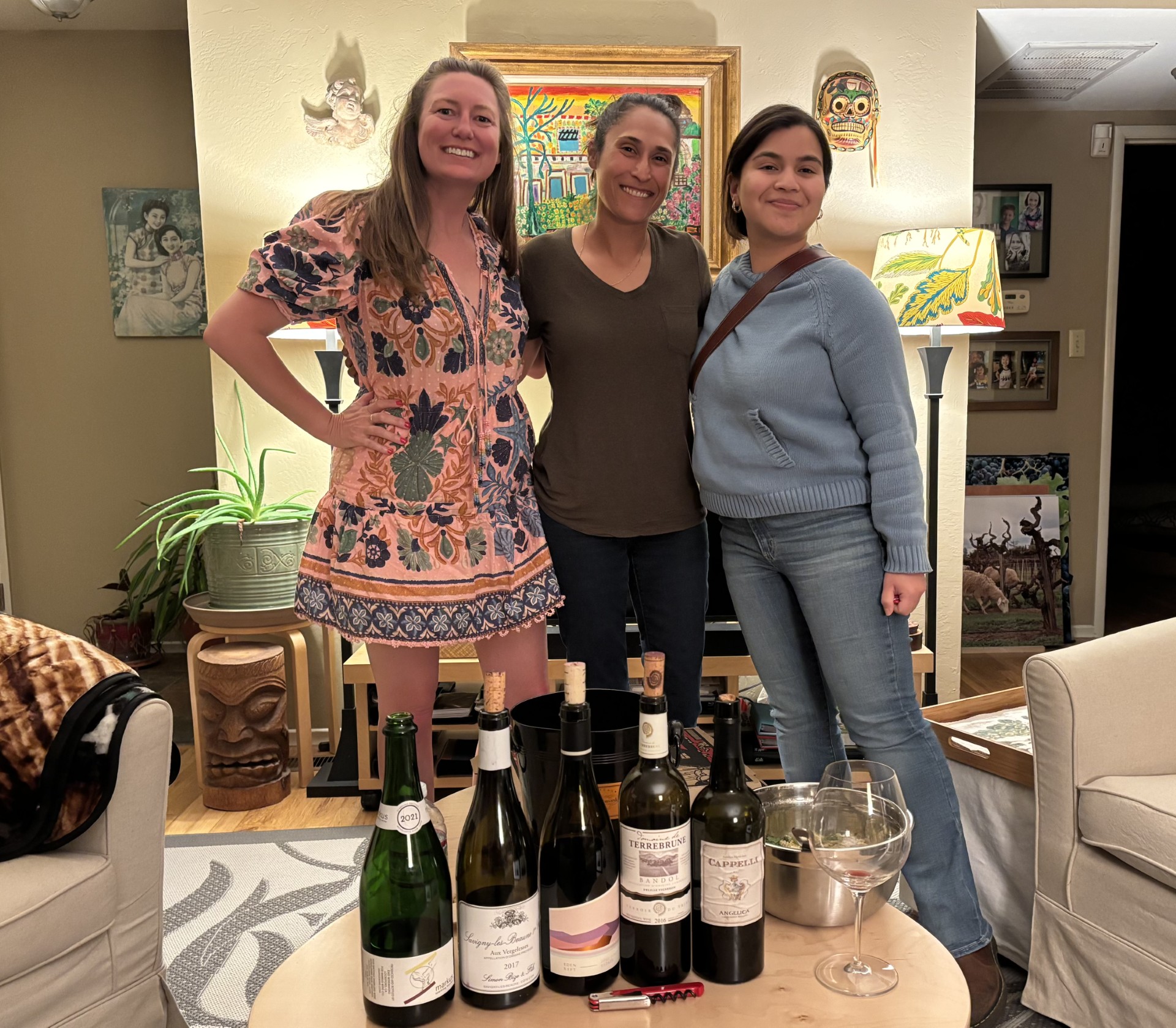 If you have children or grandchildren age 21 or over, host a Vino & Vinyls night for them and their friends. Let them play records and open tons of different bottles of wine so they can try different grape varieties and different styles. Teach them responsible tasting by having appetizers and water readily available. Have them help you open the wine bottles so that they learn how to do that. If you are a Lodi grower, you get a discount at the Lodi Wine Visitor Center and you can find over 30 different grape varieties for sale at any given time. Staff can help you select the wines. As a bonus, start the evening with a sunset vineyard walk! Above photo of an actual Vino & Vinyls night at the home of Randy Caparoso with Stephanie Bolton (author), Christina Lopez, and Anna Delgado.