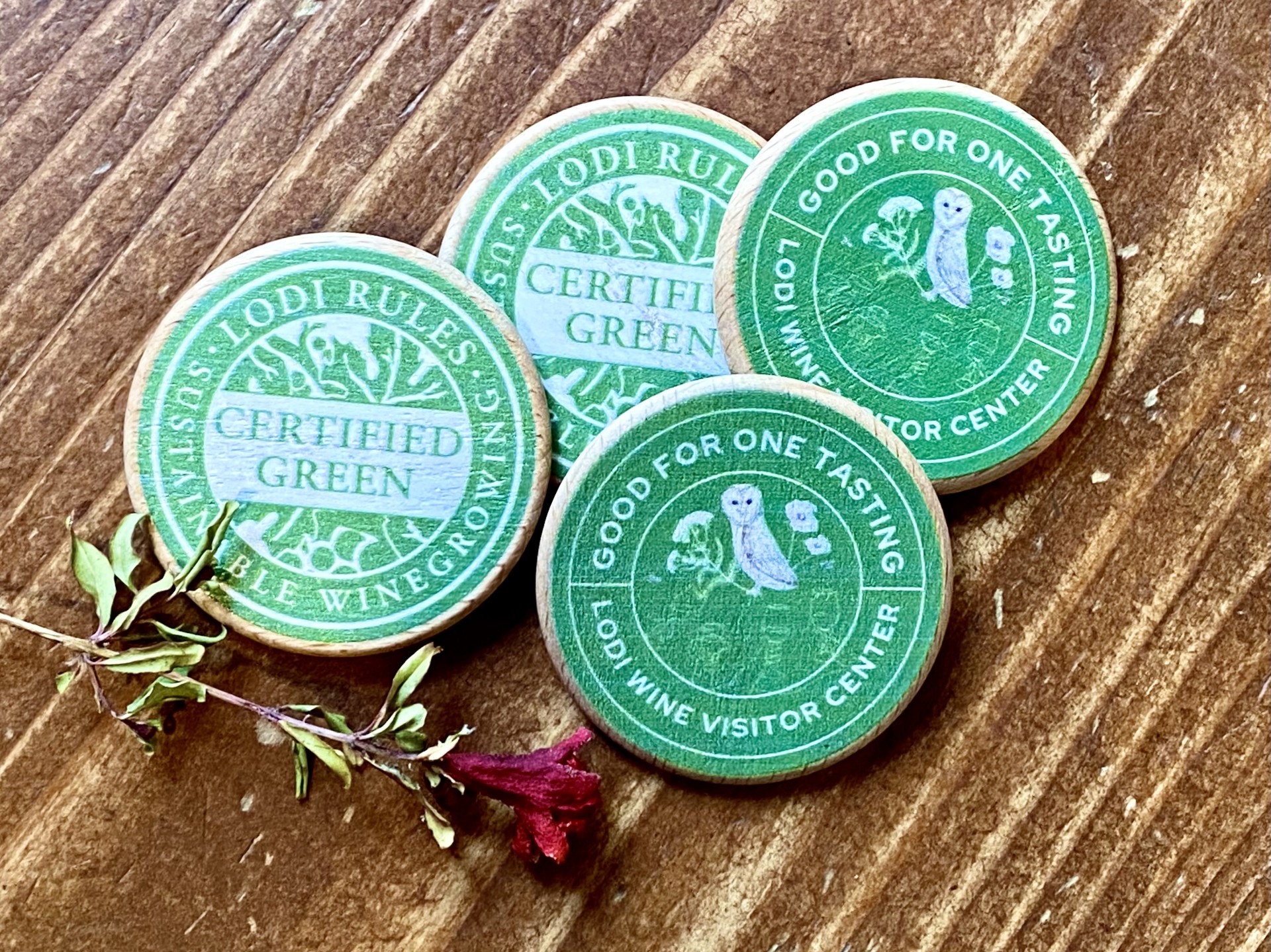 We made you wooden nickels! Lodi growers can now get wooden nickels, tokens good for one free wine tasting at the Lodi Wine Visitor Center. The idea is that you will take these on trips and give them to restaurant servers, wine shop salespeople, and young people just learning about wine. There are so many restaurant and wine shop folks in Sacramento and the Bay Area who have never been to Lodi wine country and just need an excuse to visit. Wooden nickels are available at the LODI RULES Annual Meeting, the Lodi Winegrape Commission Annual Meeting, Unified, Board/Committee Meetings, and grower meetings.