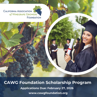 The CAWG Foundation is now accepting applications for its 2026 scholarship program. Scholarships are awarded based on financial need, academic achievement, community involvement, and personal stories. Eligible students must have a parent or legal guardian employed in a California vineyard. Students may study a subject of their choice.
