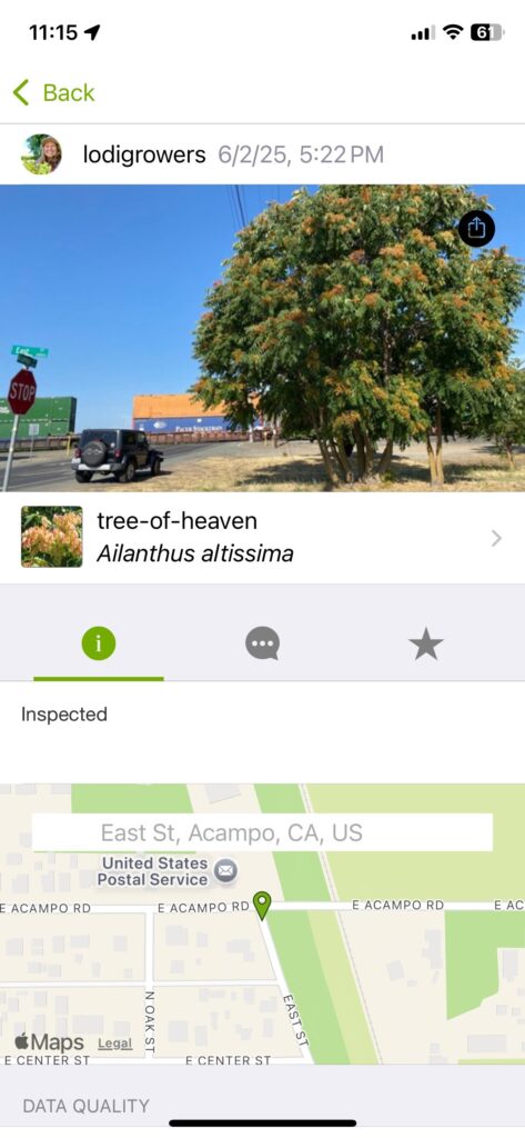 A screenshot of an “Inspected” tree located in downtown Acampo taken by user “lodigrowers” on the iNaturalist app.