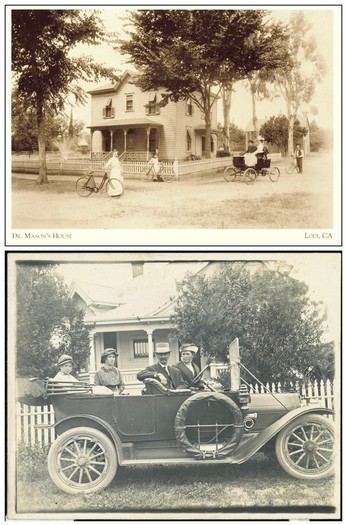 Rapid progress: In 1900, Dr. Wilton Mason proudly shows off his horseless carriage (Lodi’s first ever) with his family in front of their home at North School and West Elm Streets; in the second photo from 1911, Henry and Jessie Beckmen (daughter of Joseph Spenker) with their daughters Vera and Anita in their new EMF Studebaker. Lodi Historical Society and Wanda Woock’s Jessie’s Grove